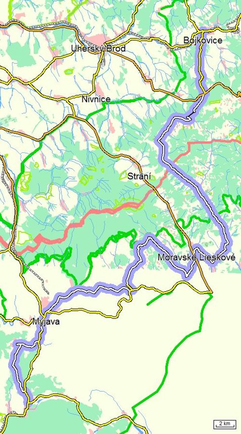 Ze Staré Turé pokračujeme oblastí Myjavských Kopanic, krásným a malebným krajem v prostředí Malých Karpat. Mnohé vísky jsou dnes přeměněny na chatové osady, které umožňují odpočinek během víkendů. Ticho, klid a krásná příroda jsou hlavní devizou tohoto kraje. Po ujetí přibližně 16 km zavítáme do města Myjava. Tato obec nabízí možnost přespání v místních hotelech nebo penzionech. V blízké Staré Myjavě máte možnost využít chatovou oblast.