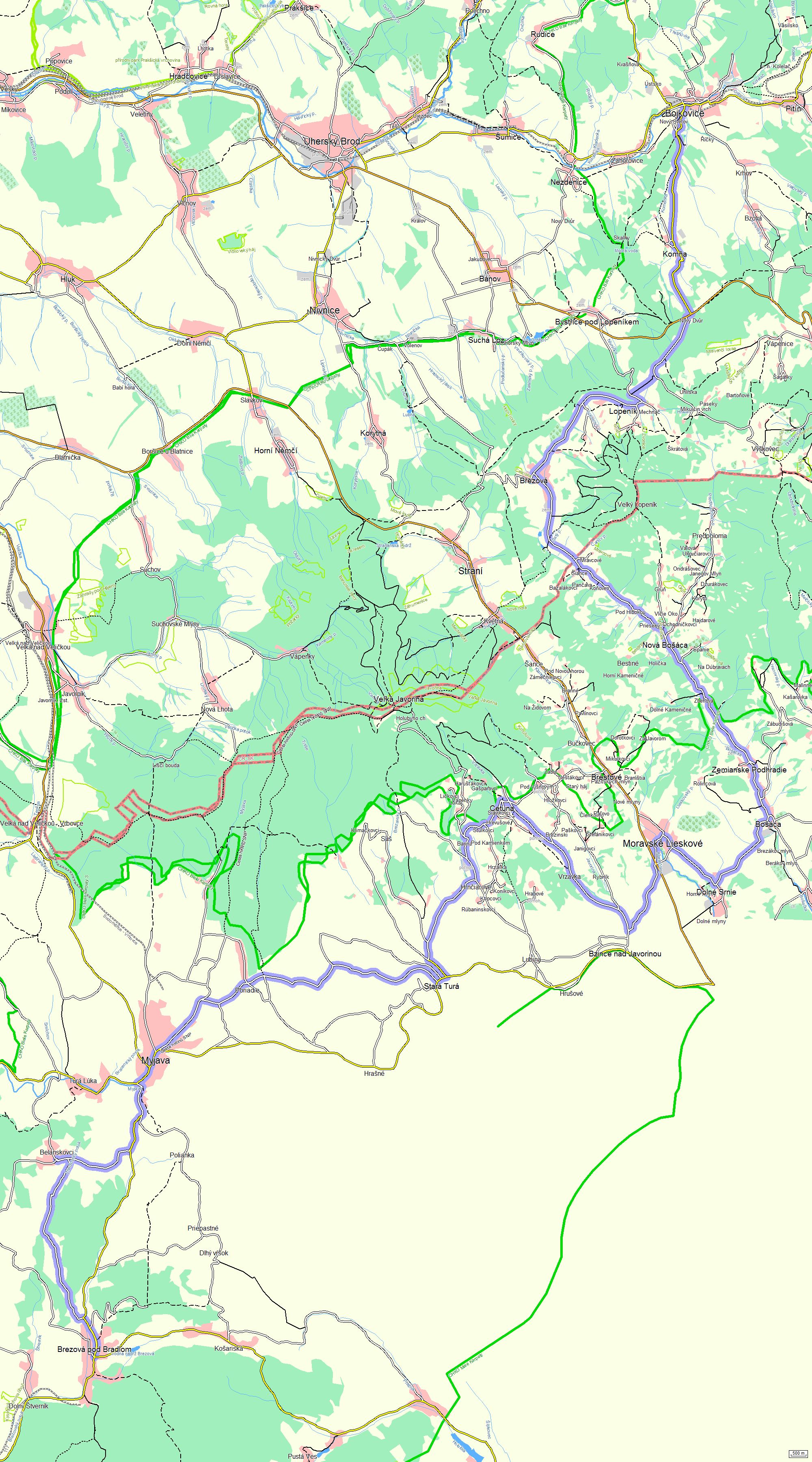 Budeme pokračovat dál po cyklotrase č. 46 a přijedeme do obce Březová. Dominantou obce je novogotický kostel sv. Cyrila a Metoděje, který je chráněnou památkou. Na území obce můžete navštívit přírodní památky, jako jsou Cestiska, Dubiny, Kalabová a Studený vrch. Tato území jsou významná pro svou ojedinělou floru a faunu. V okolí obce vyvěrá mnoho minerálních pramenů – kyselek. Celá oblast Bílých Karpat je vzácná výskytem orchidejí. V Březové odbočíme na cyklotrasu č. 5053. Pokud budeme dále pokračovat po cyklotrase, přejedeme československé hranice a dorazíme do slovenské obce Nová Bošáca. Stále projíždíme malebnou vrchovinou chráněné krajinné oblasti Bílé Karpaty. Po ujetí přibližně 13 km dojedeme do obce Moravské Lieskové, poté pokračujeme přes obce Zemianske Podhradie, Bošáca a Dolné Srnie. Při průjezdu obcí Bošáca se můžeme zastavit v muzeu skanzenového typu. Pokud se rozhodneme jej navštívit, musíme návštěvu oznámit na místím obecním úřadě. Z Bošáce vás odbočka doleva na konci obce po pouhém kilometru zavede do Haluzic se zajímavým opevněným kostelíkem. Na stejném rozcestí pojedete rovně, dorazíte do Trenčianských Bohuslavic. Zpět na naší trase, v obci Moravské Lieskové, ale i jejím okolí, pak můžeme vidět bohatá archeologická naleziště z mladší doby bronzové.