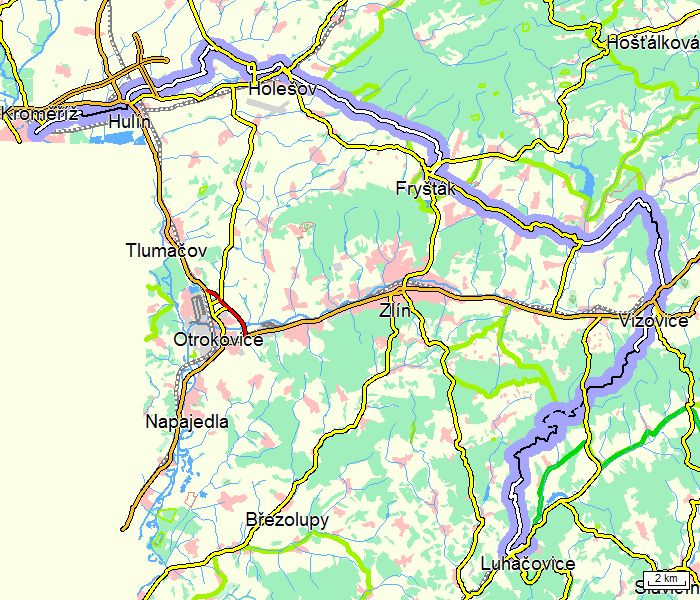 Ze Slušovic budeme pokračovat po stávající cyklostezce směrem do obce Hvozdná a zlínské městské části Štípa. Obec Hvozdná dostala své jméno podle místa založení, v hlubokých hvozdech roku 1446 a mezi památky které zde můžeme hlédnout je kaple Panny Marie Sedmibolestné z roku 1870. V obci Štípa nás může zaujmout pohled na Kovářův zděný mlýn holandského typu anebo můžeme využít možnosti navštívit poutní chrám Narození Panny Marie. Od tohoto kostela se ve vzdálenosti asi 1 km nachází ZOO Lešná, v jejíž expozici rozdělené do jednotlivých geografických oblastí nalezneme přes 210 druhů zvířat a v přilehlém parku na 1000 druhů rostlin. Zoologické zahradě dominuje původní zámek, který slouží z části jako prostor pro expozici plazů a z části jako výstavní prostory.