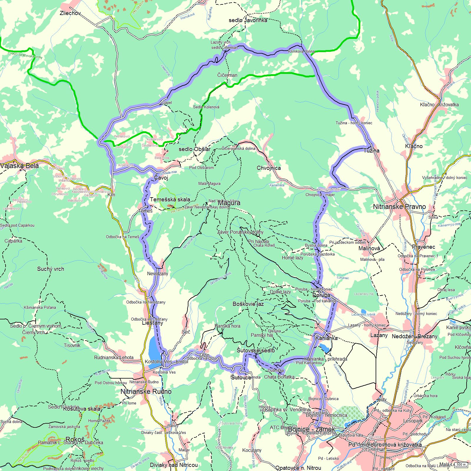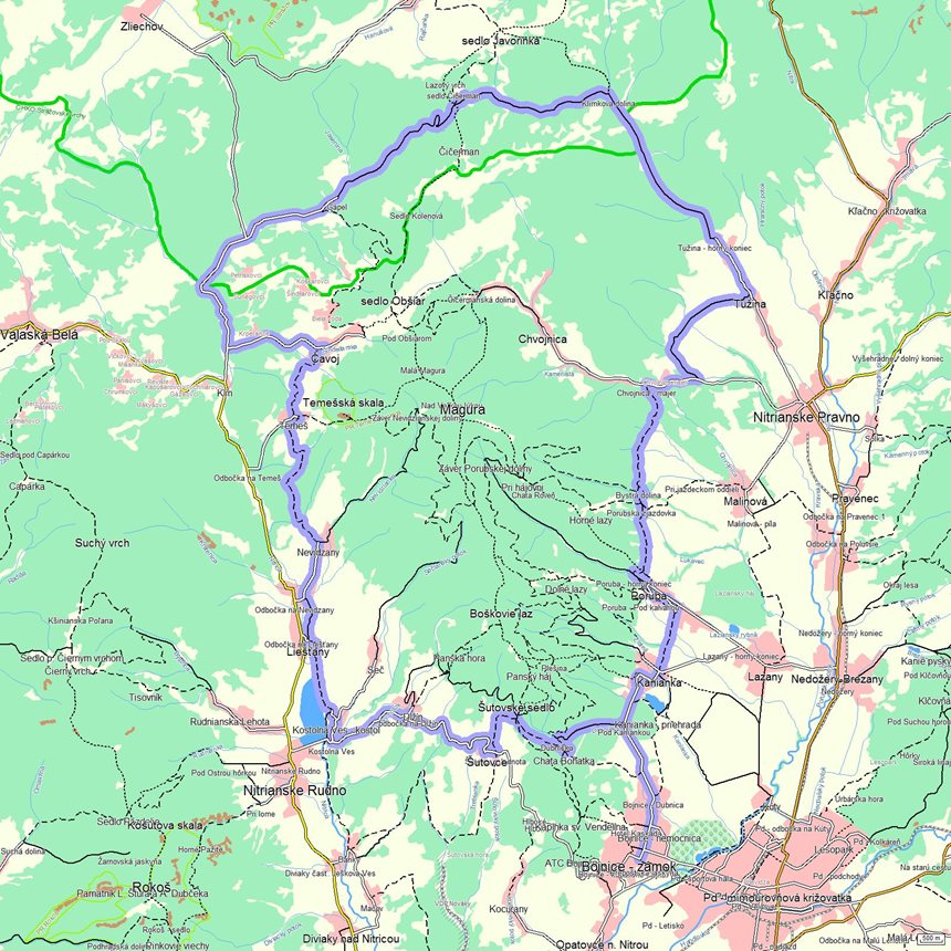 Po průjezdu Bojnicemi se vydáme směrem na Šútovce po cyklotrase č. 5317. Do obce dojedeme po 8 km. Obdivovat zde můžeme tři kapličky pocházející z roku let 1900 – 1920. Budeme pokračovat dál po cyklotrase a dojedeme k obci Nitrianske Rudno. Poblíž obce se nachází vodní nádrž, která v letních měsících slouží k rekreaci a k rybolovu a na jejímž břehu leží kemp – Camping Nitrianske Rudno. Dominantou vesnice je římsko-katolický kostel postavený na začátku 19. stol. Cyklotrasa pokračuje – odbočíme doprava ještě před přehradou – do obce Nevidzany. Když projedete obcí, určitě si všimnete, že má mladistvý vzhled. Přesto obec není nijak výjimečně mladá, na začátku 20. století však byla vypálena. Pokračujeme dál po cyklotrase č. 2308 a projedeme malou obcí Temeš. Zde můžete zvolit asi kilometr a půl dlouhou odbočku doprava, vhodnou spíše pro pěší chůzi, a vystoupit po žluté turistické stezce na Temešskou skálu, vzácnou přírodní lokalitu s unikátním výhledem do okolí. Pokud se rozhodnete pokračovat po cyklotrase, dojedete po 2 km do podhorské vesničky Čavoj. Pokud v obci Krpeľance zabočíte doleva a ve vesničce Klin zahnete doprava, můžete se podívat do obce Valaská Belá, ve které je unikátní sklářský skanzen s živou ukázkou výroby skla. Budete-li unavení, obec Čavoj nabízí možnost přespání ve Zbojnických chaloupkách. V opačném případě pokračujeme dále po cyklotrase. Po 8,5 km dojedeme do další obce Gápel a dále na křižovatku cyklotras 2308 a 019, kde se vydáme doprava po cyklotrase č. 019 a přijedeme do obce Tužina. Odbočka doleva po cyklotrase 019 by vás zavedla do obce Čičmany se souborem unikátních malovaných dřevěnic i moderním lyžařským střediskem. Zpět na naši trasu – v obci Tužina můžete navštívit například kostel sv. Jakuba, ve kterém jsou restaurované interiérové malby nebo využít možnosti občerstvení v místním hostinci. Uprostřed obce zabočíme doprava a budeme dál pokračovat po cyklotrase č. 019. Při následném průjezdu obcí Chvojnica nepřehlédněte kulturní památky – kamenný síňový kostel z roku 1935. Pokračujeme dál v cestě a přes obec Poruba dorazíme do Kanianky. Při obce leží přehrada s možností koupání a v samotné obci je dostatek ubytovacích a stravovacích zařízení. Odsud nám zbývají pouze poslední 3 km do Bojnic, kde náš okruh končí.